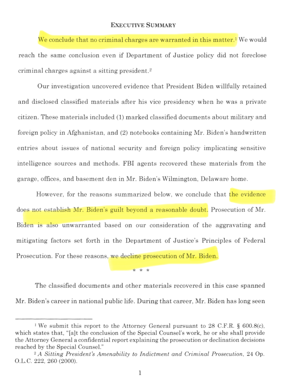“We conclude the evidence is not sufficient to convict, and we decline to recommend prosecution of Mr. Biden…” (near the end of p. 6)