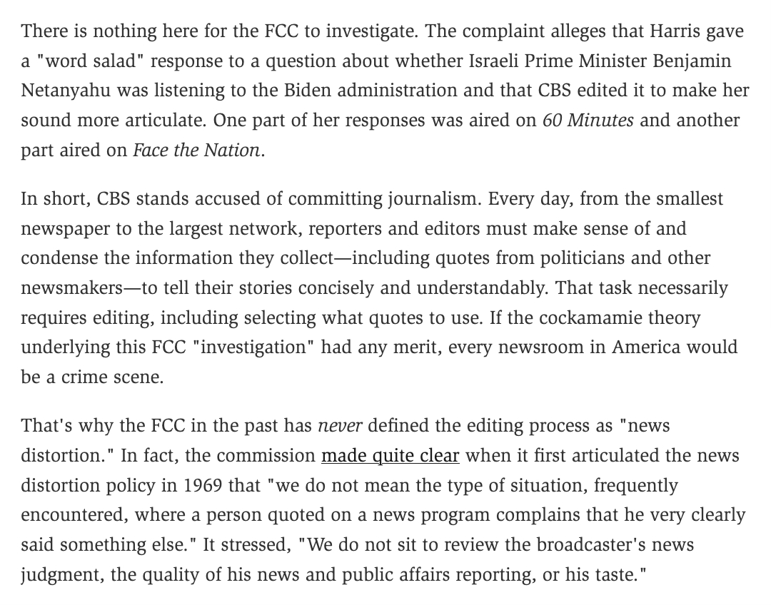 The FCC "is conducting an unseemly & unconstitutional spectacle, ostensibly to determine whether CBS violated its policy against 'news distortion' by editing" an interview w/Harris, writes Robert Corn-Revere @reason.com "Its real purpose is to exercise raw partisan power" reason.com/2025/03/14/t...
