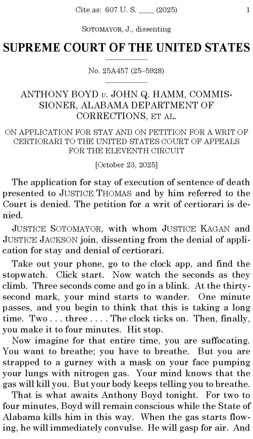 #SCOTUS denies a stay of execution to Alabama death-row prisoner Anthony Boyd, over *quite* a dissent from the three Democratic appointees, written by Justice Sotomayor, about the problems with nitrogen hypoxia as a method of execution: