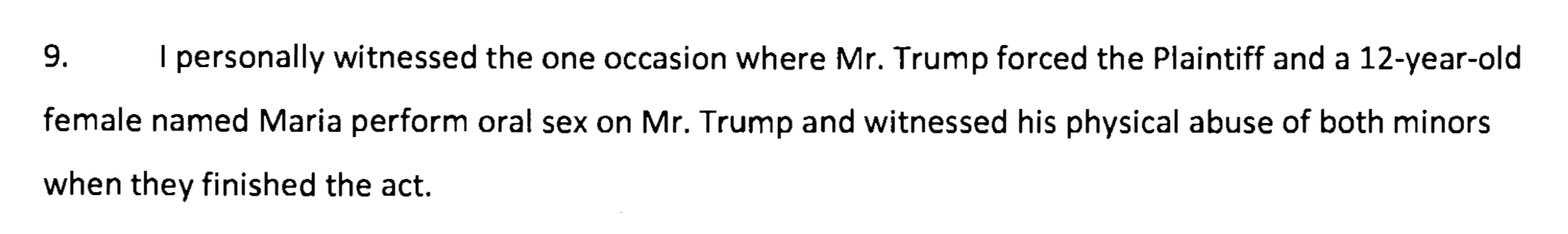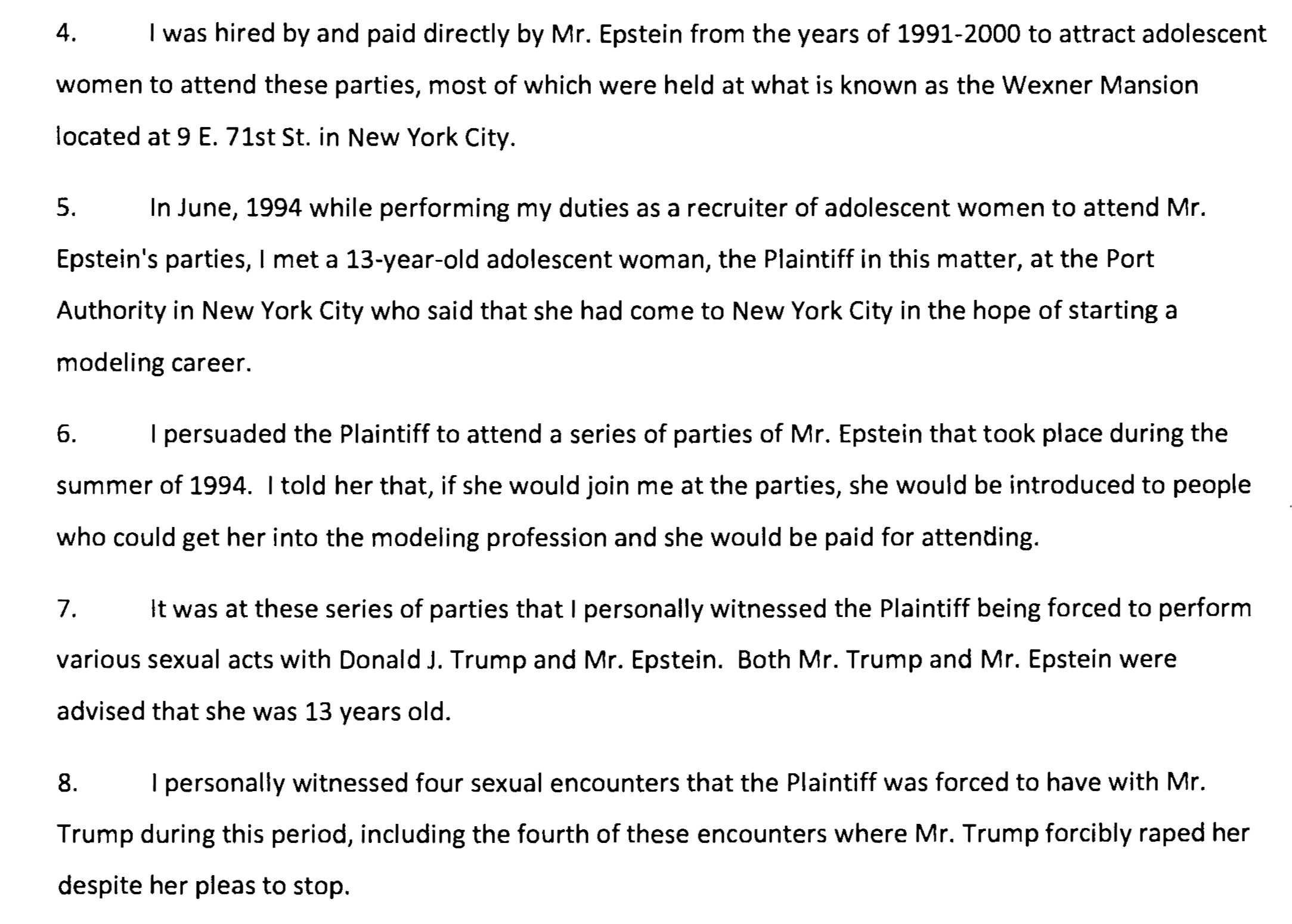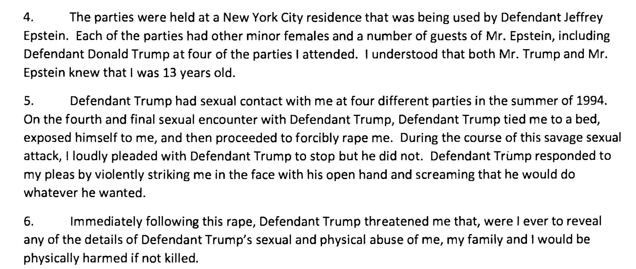 Maybe the release of the Epstein files will explain why this corroboration of the prior which also alleges a the rape of a 12 year old girl by Trump is somehow not as bad as it looks. https://www.courthousenews.com/wp-content/uploads/2024/07/tiffany-doe-affidavit.pdf