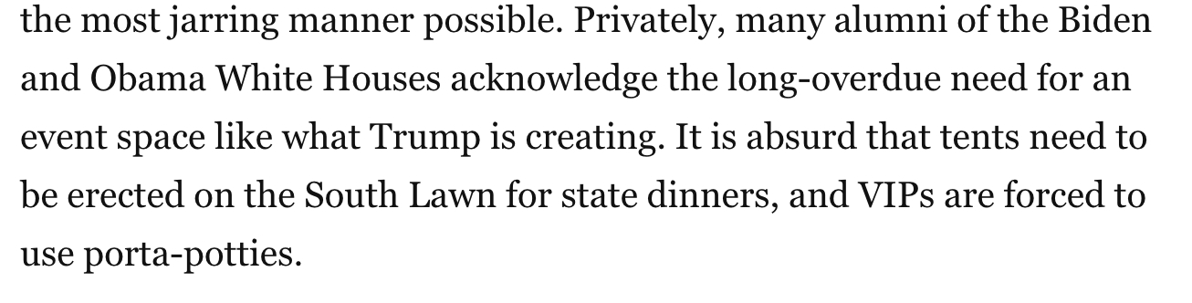 I mean, who specifically is saying this? How many State Dinners even happen in a year? A couple? (en.wikipedia.org/wiki/List_of.... Maybe you can add on some other events, how many are we talking? We tore down a third of the White House to build a hotel ballroom for a handful of events per year?