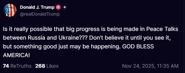 "Is it really possible that big progress is being made in Peace Talks between Russia and Ukraine??? Don’t believe it until you see it, but something good just may be happening."