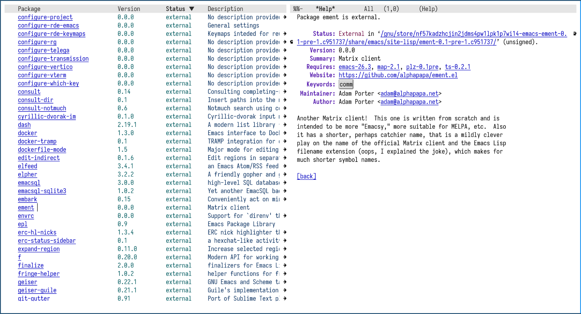 is merged and now all Emacs packages built with emacs-built-system in Guix finally has -pkg.el file and therefore explorable with M-x list-packages, C-h P and other related functions.
