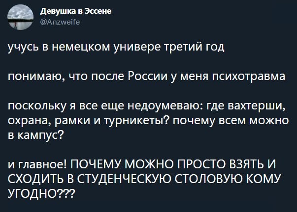 @molotchino о, да. Причём - это и про остальные цивилизованные страны сказать можно. И не только в ЕС. Во многих странах бывал в институтах, нигде не было "пропускной системы". Если и есть охранник - то сидит где-то глубоко, и выполняет работу "алло, справочная".