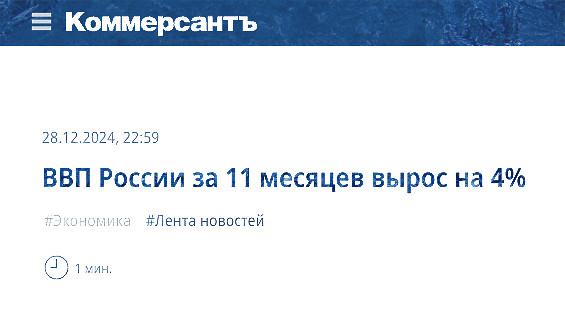 "Рост ВВП России в ноябре 2024 года составил 3,6%, говорится в обзоре Минэкономики «О текущей ситуации в экономике» (.pdf)".