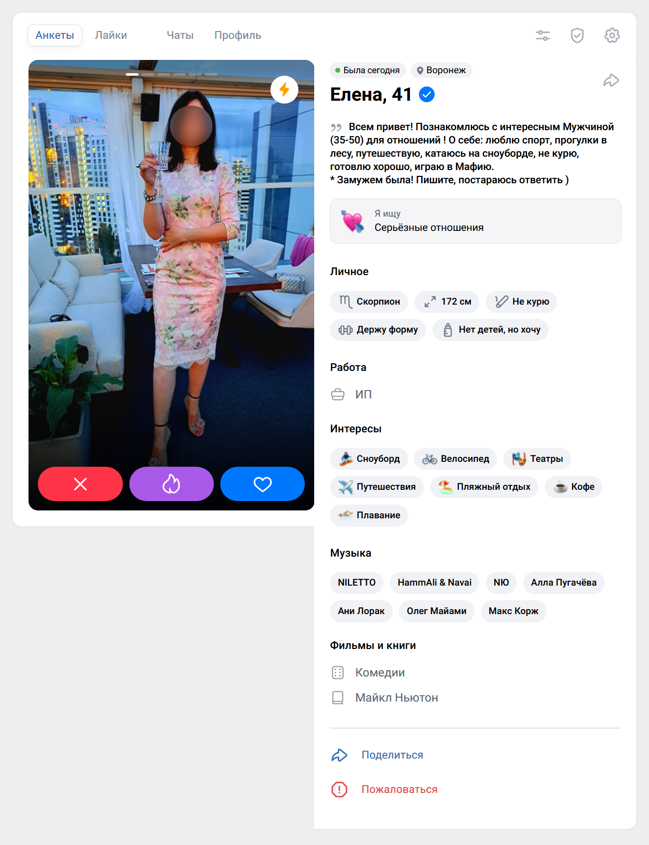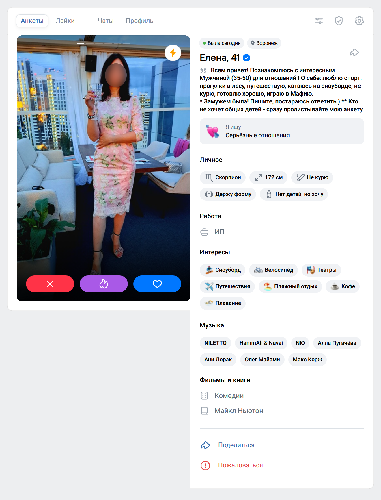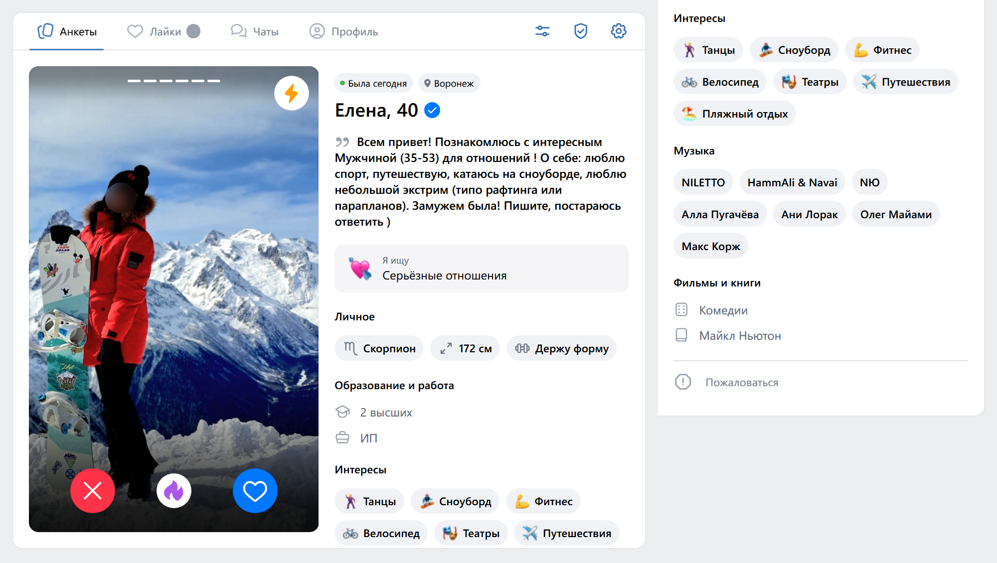 К февралю 25-го героиня стала старше, удалила из анкеты, что у неё два высших образования и до зевоты предсказуемо добавила «хорошо готовлю».🤦♂️