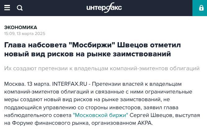 "Москва. 13 марта. INTERFAX.RU - Претензии властей к владельцам компаний-эмитентов облигаций и связанные с ними ограничительные меры создают новый вид рисков на рынке заимствований, не поддающийся управлению со стороны инвесторов, заявил глава наблюдательного совета "Московской биржи" Сергей Швецов, выступая на Форуме финансового рынка, организованном АКРА".
