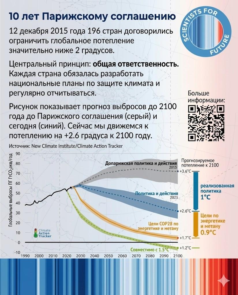 Целью было не превысить 1,5°C (зеленая линия), но мы подошли к этому порогу уже сейчас, а не в 2100-м. Новые меры (оранжевая линия) сбивают температуру, но текущая политика (синяя) всё ещё ведет к опасным +2,6°C. Единственный плюс — без действий вообще (серая линия) было бы +3,6°C.