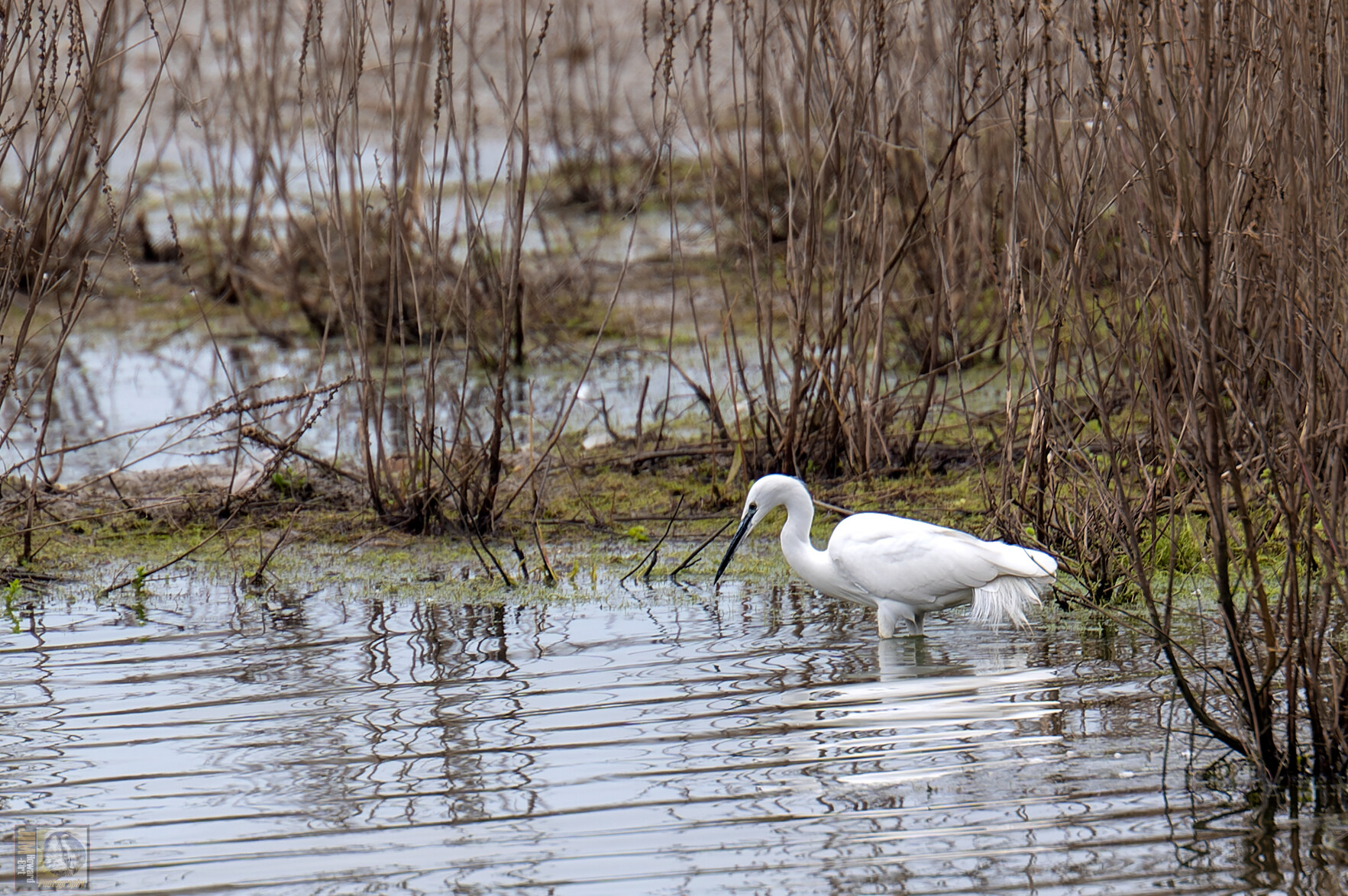 A little Egret looking for fish in the silvery waters of Floodplain Forest Lake.