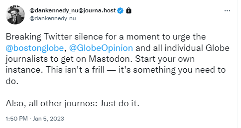If you are not following yet, #Journalist Dan Kennedy is worth your follow. I too am locked on Twitter only going in to advocate for #Mastodon, hoping my buddies will come on over.. but look how hard @dankennedy_nu