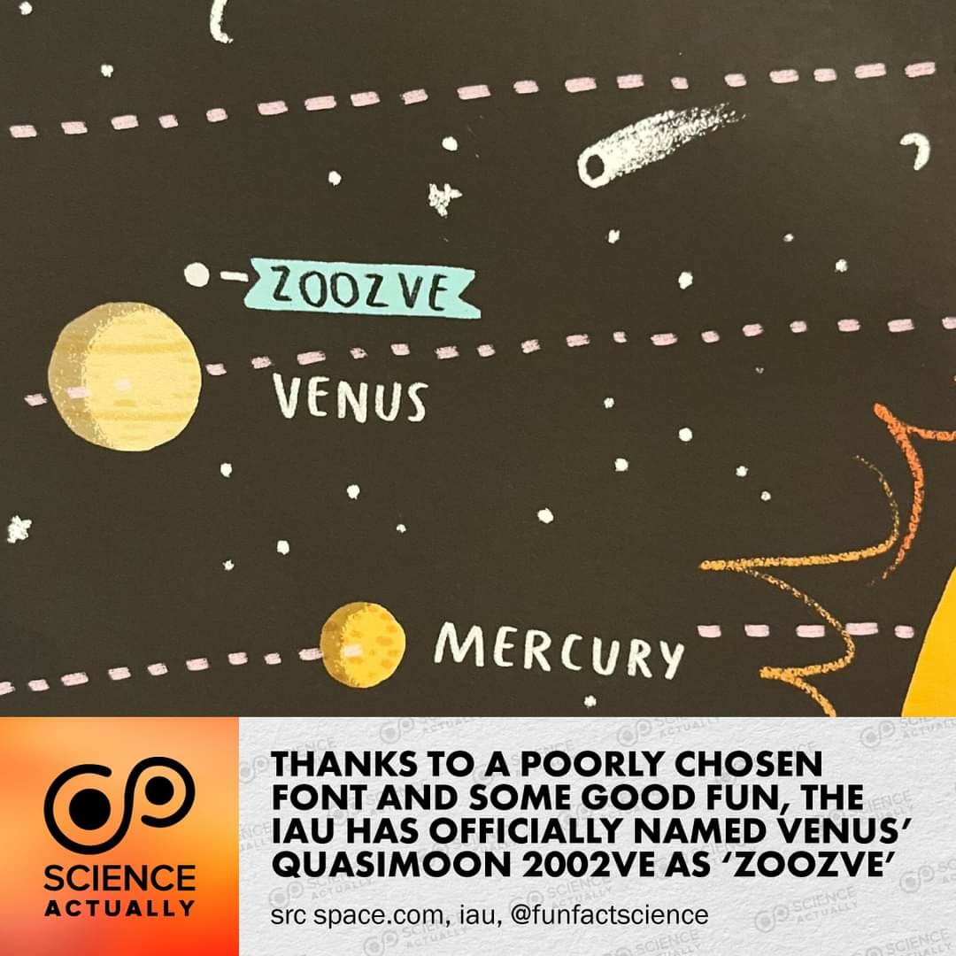 Thanks to a poorly chosen font and some good natured fun, the The International Astronomical Union has officially named Venus' quasi-moon 2002VE as 'Zoozve'.