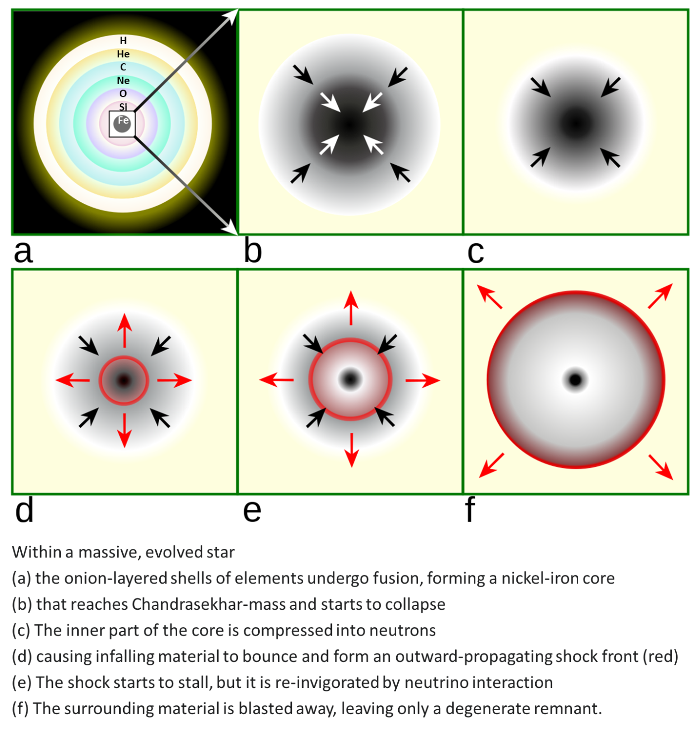 The graphic below describes the process that leads to the supernova explosion in such stars.