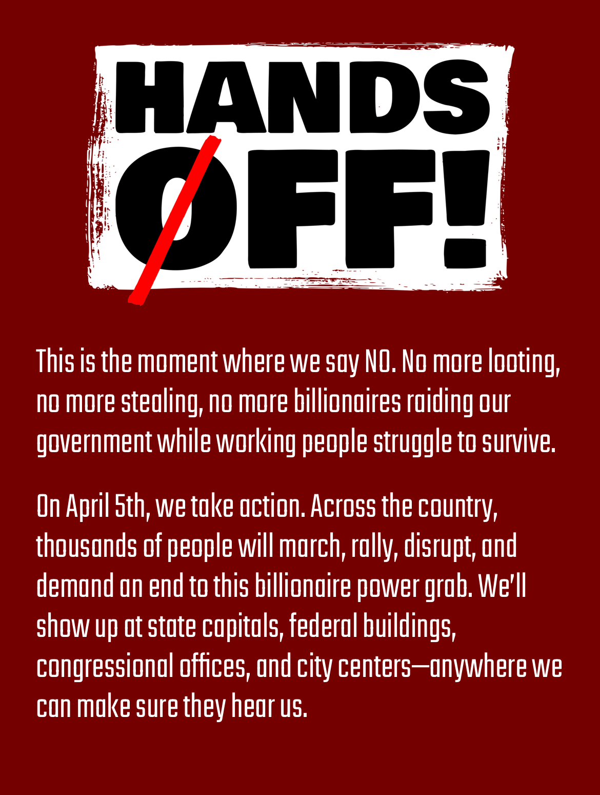 Call to Action: On April 5th, take to the streets to say Hands Off. Spread the word, fire up your networks, and make sure everyone knows: “We don’t have kings in the US, and we won’t let a handful of billionaires run our country into the ground.” #3E #USprotests #HandsOff