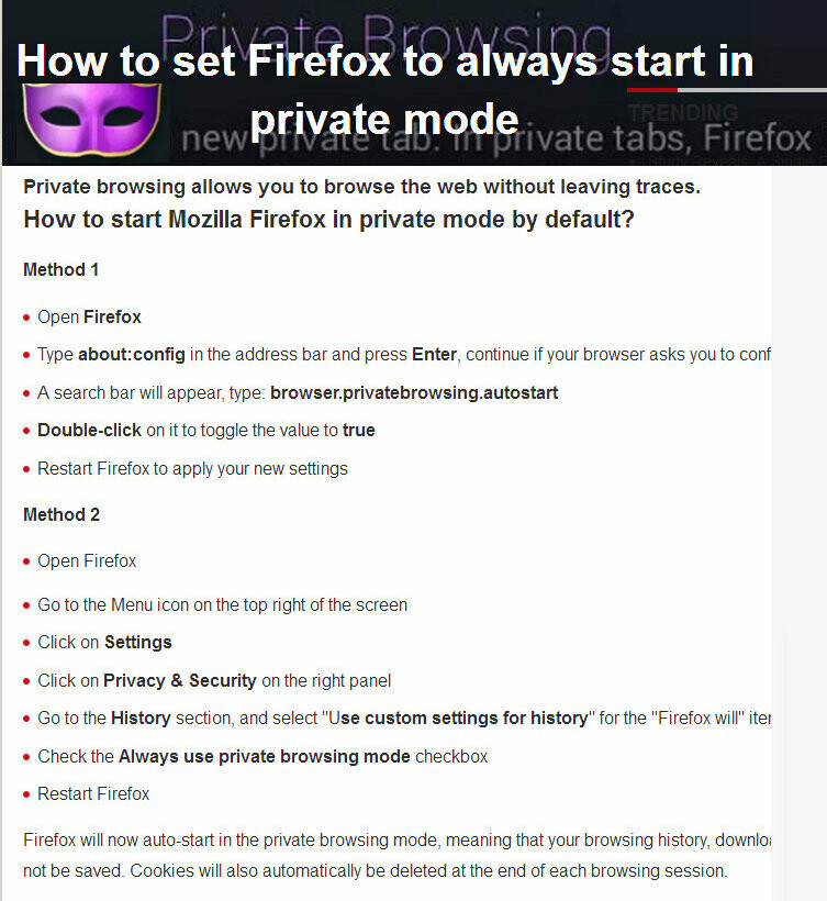 Firefox will now auto-start in the private browsing mode, meaning that your browsing history, download history, searches, and form history will not be saved.