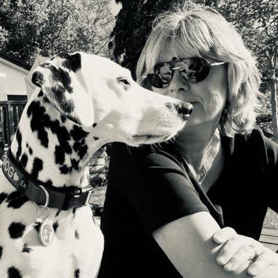 •Profile picture: white man, gray sweater on the right side of frame sitting on floor in front of couch with a dog on it, wearing white & purple hoodie with face under red frisbee with some edge chewed off.