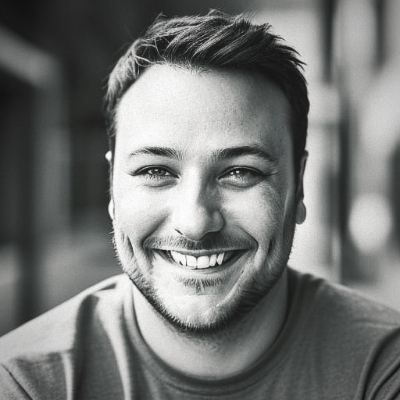 •Profile picture: white man, gray sweater on the right side of frame sitting on floor in front of couch with a dog on it, wearing white & purple hoodie with face under red frisbee with some edge chewed off.