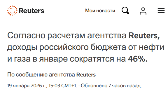 "Согласно расчетам агентства Reuters, доходы российского бюджета от нефти и газа в январе сократятся на 46%".