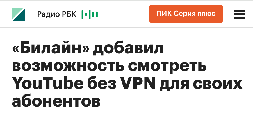 "«Билайн» добавил возможность смотреть YouTube без VPN для своих абонентов".