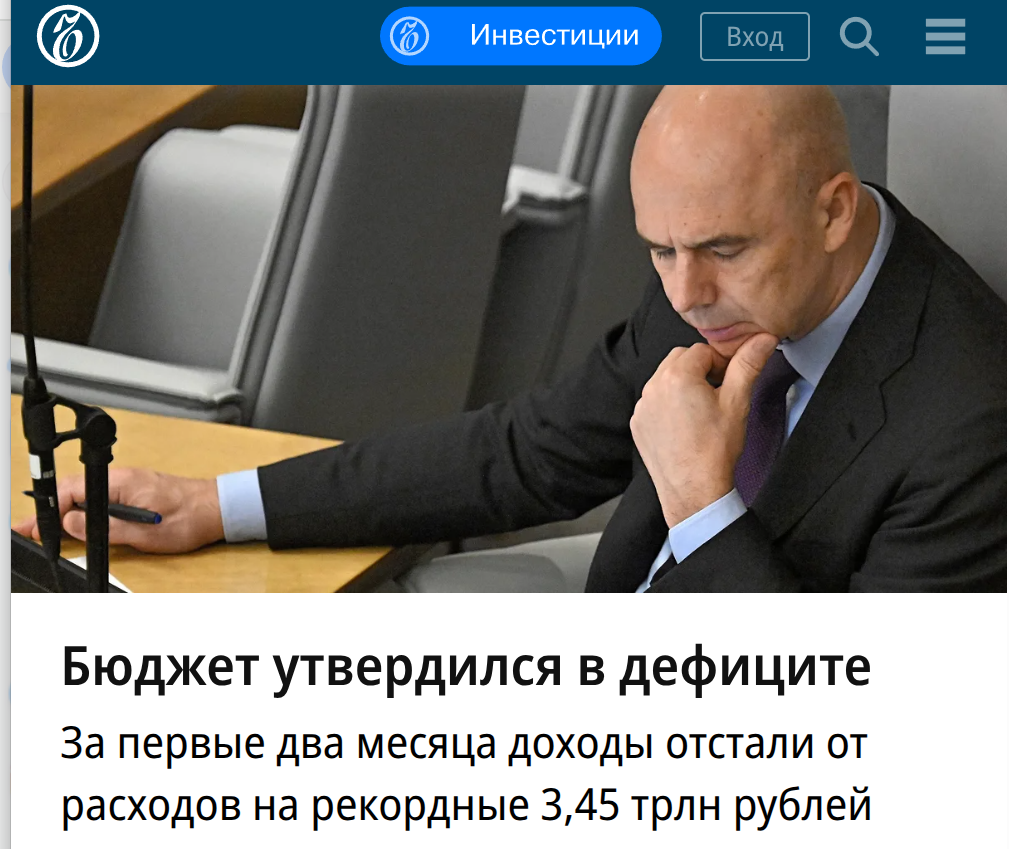 "Дефицит федерального бюджета по итогам января—февраля вырос до 1,5% ВВП, или 3,45 трлн руб., почти выполнив таким образом «план» по этому показателю на весь 2026 год.