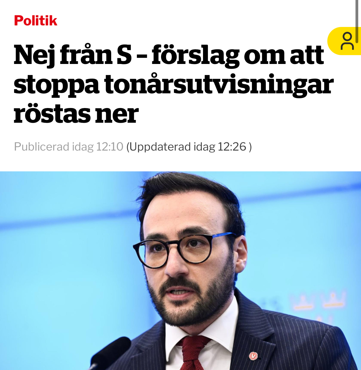 Omröstning i socialförsäkringsutskottet idag: stoppa tonårsutvisningarna? Nej: S, SD, M, KD, L Ja: C, V, MP www.etc.se/inrikes/tona...